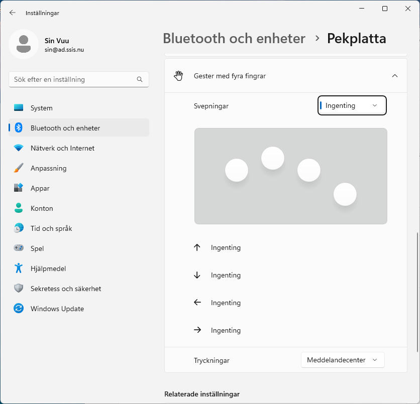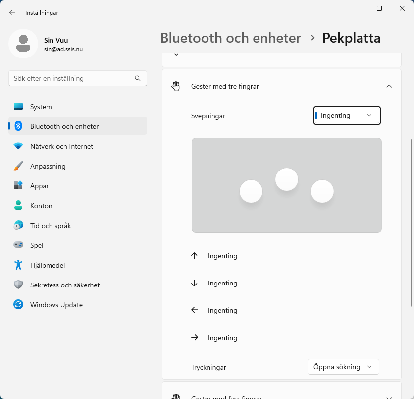 För att undvika att Safe Exam Browser kastar ut dig från provet om du råkar dra handen över pekplattan så bör du stänga av svepningar. Stäng av svepfunktionerna för både tre och fyra fingrar via Inställningar > Bluetooth och enheter > Pekplatta.